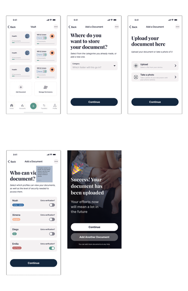 This led to the Vault Feature: a secure digital storage space within Future Money where users could store, encrypt, and share sensitive financial documents with trusted family members. The goal was to prevent financial disruption in an emergency, ensuring loved ones always had access to the resources they needed.